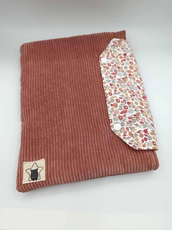 La pochette à livre (grand format) est composée d'une poche en velours cotelé ou canva avec doublure en molleton et d'un rabat en tissu imprimé fermé par deux pressions.