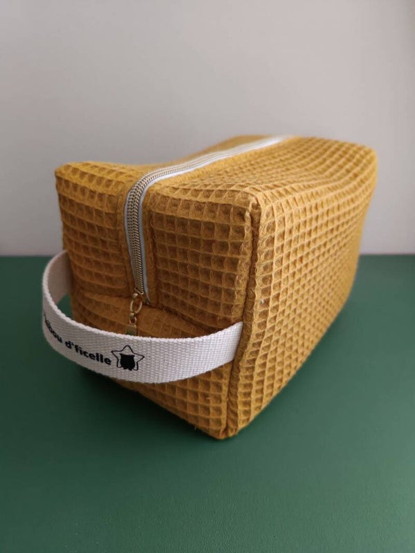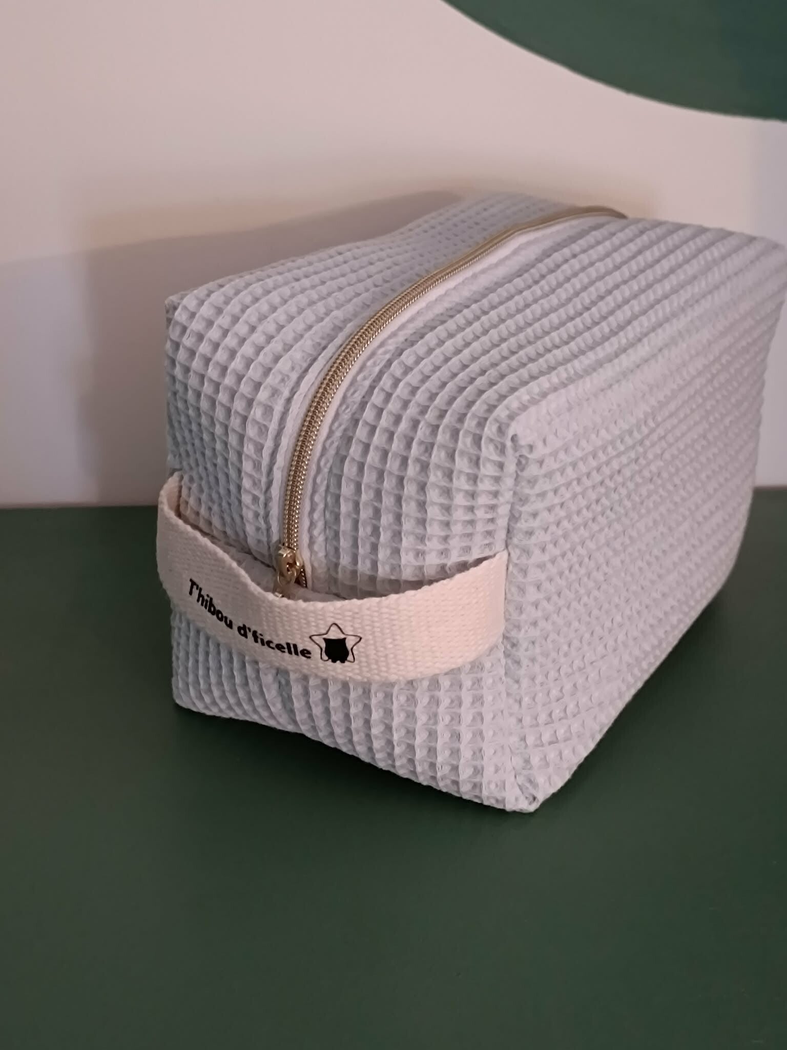 Une trousse de toilette rectangulaire en tissu nid d'abeille avec intérieur doublé tissu déperlant et sangle poignée pour un transport facilité.
